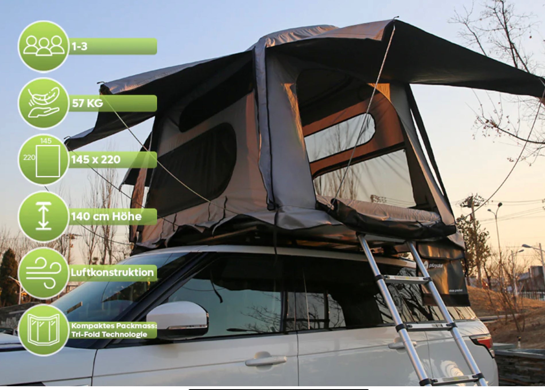 Das Sky ist ein hochwertiges Dachzelt mit einer ausgeklügelten Konstruktion und stabiler Verarbeitung. Das Dachzelt wir aufgeblasen (Pumpe ist im Lieferumfang enthalten) und ist damit sehr leicht. Dank der innovativen Technik ist es sehr formstabil - auch bei stürmischen Nächten. Das hochwertige Material und die robuste Konstruktion sorgen für einen angenehmen Schlaf, während die großen Fenster tagsüber für viel natürliches Licht sorgen.